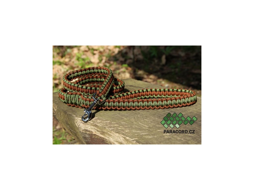 Stylové vodítko upletené z cca 20m paracordu (velikost 130cm) s vypouštěcí karabinou. Vzor pletení je plochý, 2cm široký.