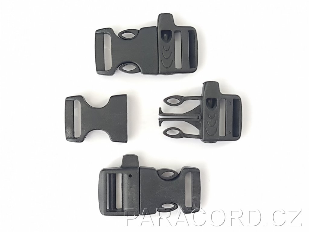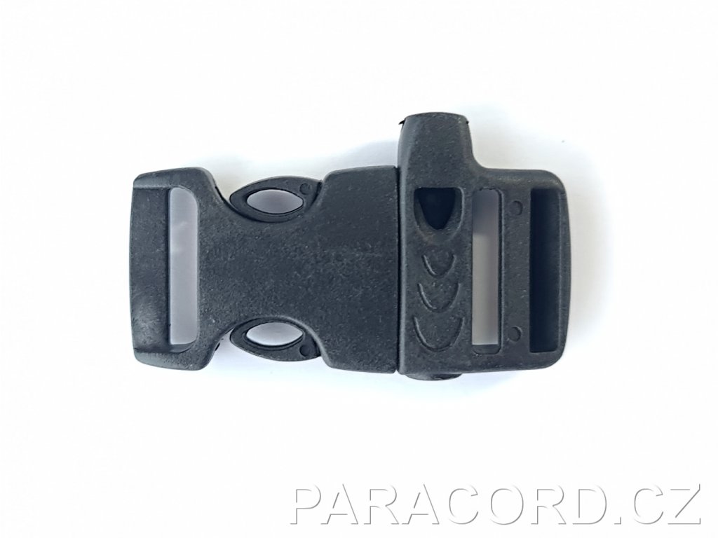 Plastová trojzubcová spona s nouzovou píšťalkou. Barva černá. Píšťalka opravdu funguje a je celkem hlasitá. Spona je vhodná hlavně na batohový popruh a lze ji využít oboustranně.