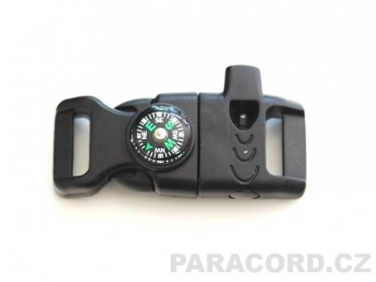 Plastová trojzubcová spona s prohnutým profilem, s nouzovou píšťalkou, magnéziovým křesadlem včetně ocílky a s minikompasem. Píšťalka opravdu funguje a je celkem hlasitá. Magnéziová tyčinka je skryta uvnitř spony jako prostřední zub trojzubce. Minikompas berte s rezervou, vzhledem ke své velikosti je spíše orientační. Spona je vhodná jak na náramek, tak na batohový popruh.