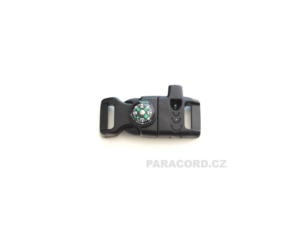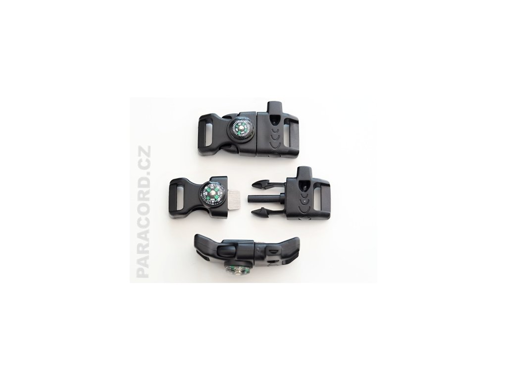 Plastová trojzubcová spona s prohnutým profilem, s nouzovou píšťalkou, magnéziovým křesadlem včetně ocílky a s minikompasem. Píšťalka opravdu funguje a je celkem hlasitá. Magnéziová tyčinka je skryta uvnitř spony jako prostřední zub trojzubce. Minikompas berte s rezervou, vzhledem ke své velikosti je spíše orientační. Spona je vhodná jak na náramek, tak na batohový popruh.